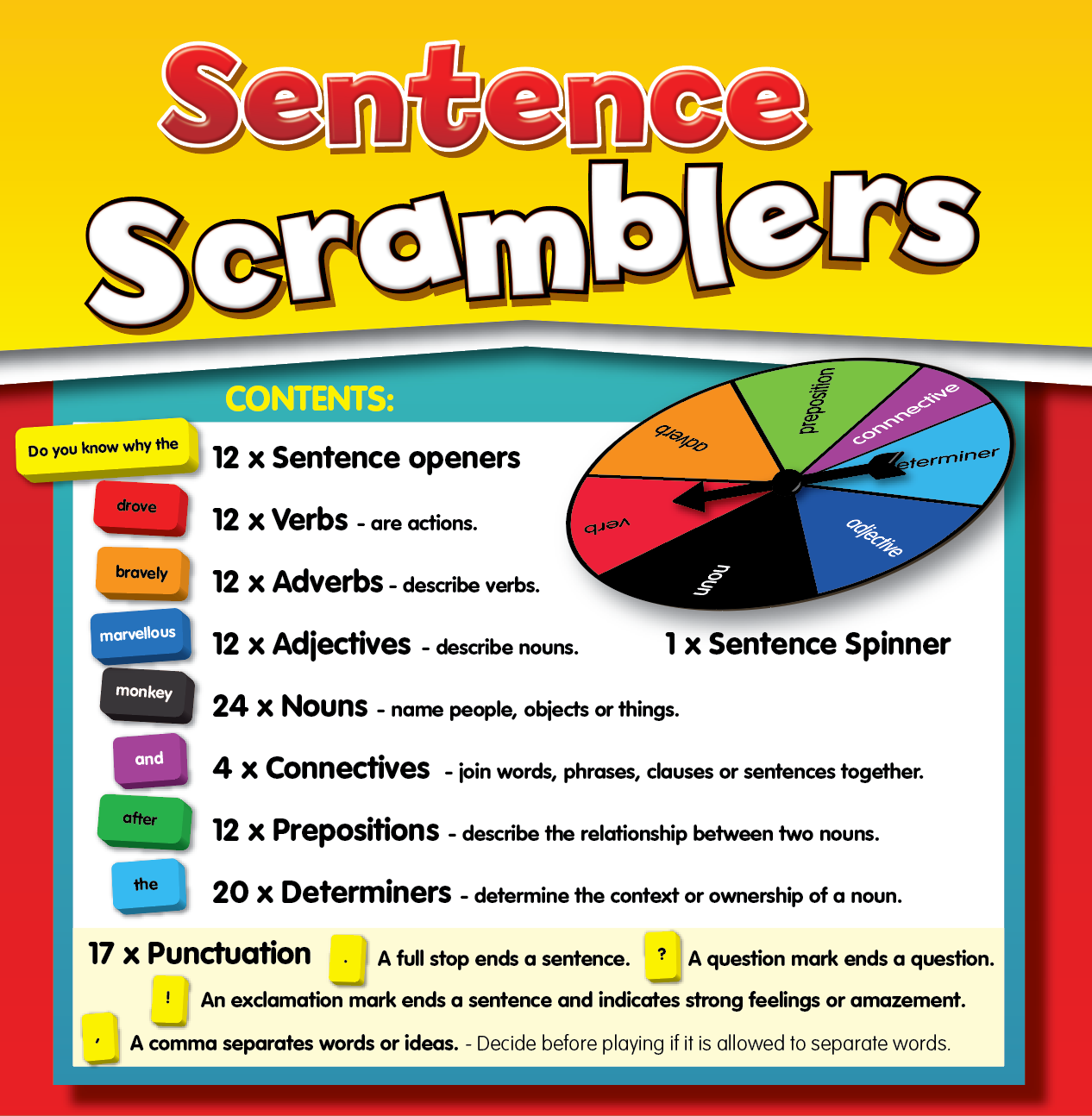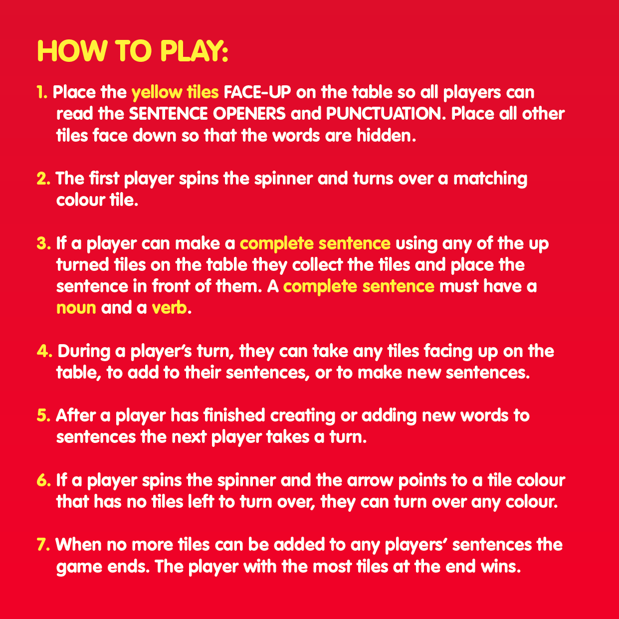 Scramble together sentence starters, words and punctuation to form wacky and creative sentences! Spin the spinner and turn over the same coloured word tile that the arrow points to. Mastermind longer sentences using adverbs, adjectives and connectives to collect the most pieces and win the game.