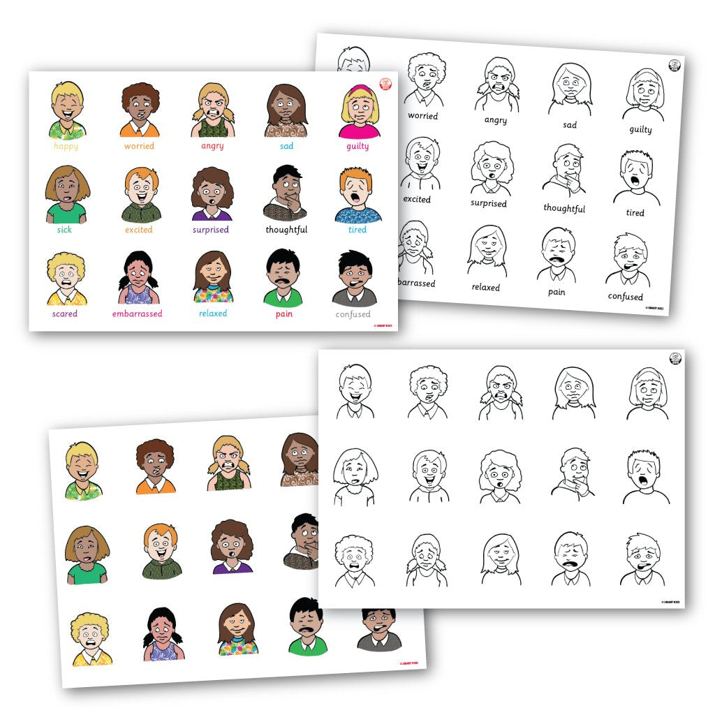 These desktop mats depict a variety of emotions. Four different versions included, one with expressions and the names of the emotion or just with expressions. In colour or black and white.