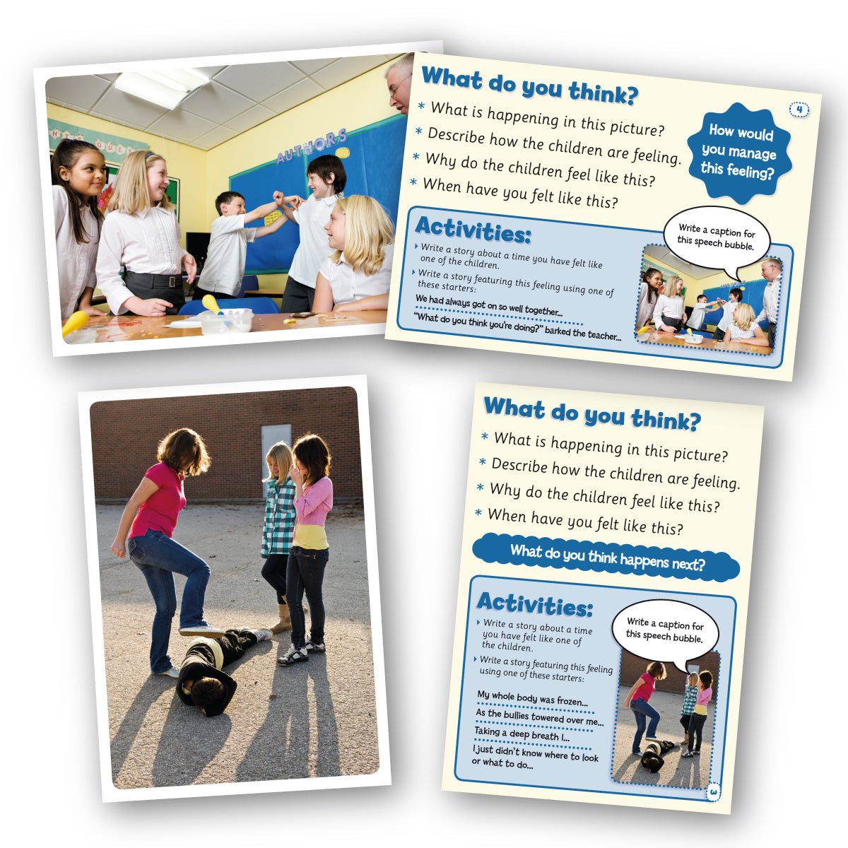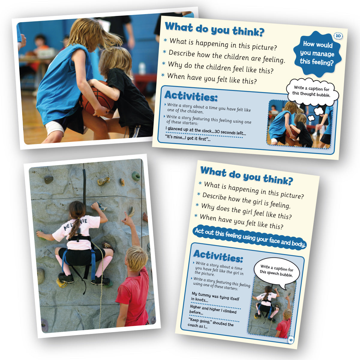 These 50 durable cards have a photographic image on one side and activities for enquiry in class, group/talk-partner discussion or circle time on the other. Story starters on the reverse will encourage thinking and development ion key social and emotional aspects of learning. The themes cover a diverse range of emotions such as fear, confusion, jealousy, excitement and sadness.