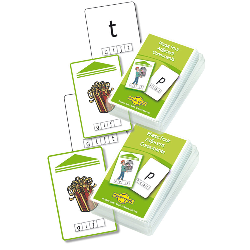 Buy both Phase 4 Chute Card packs and save! Identify the missing adjacent consonants from over 50 Phase 4 words and then revise key letters and sounds, following the progression as set out in the Letters and Sound programme. Sound talk/ read/ spell words or give specific sounds within a given word with these brilliant chute card packs. Post cards into the self-correcting Smart Chute (sold separately) to reveal the answer.