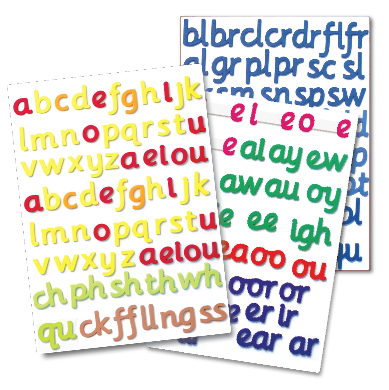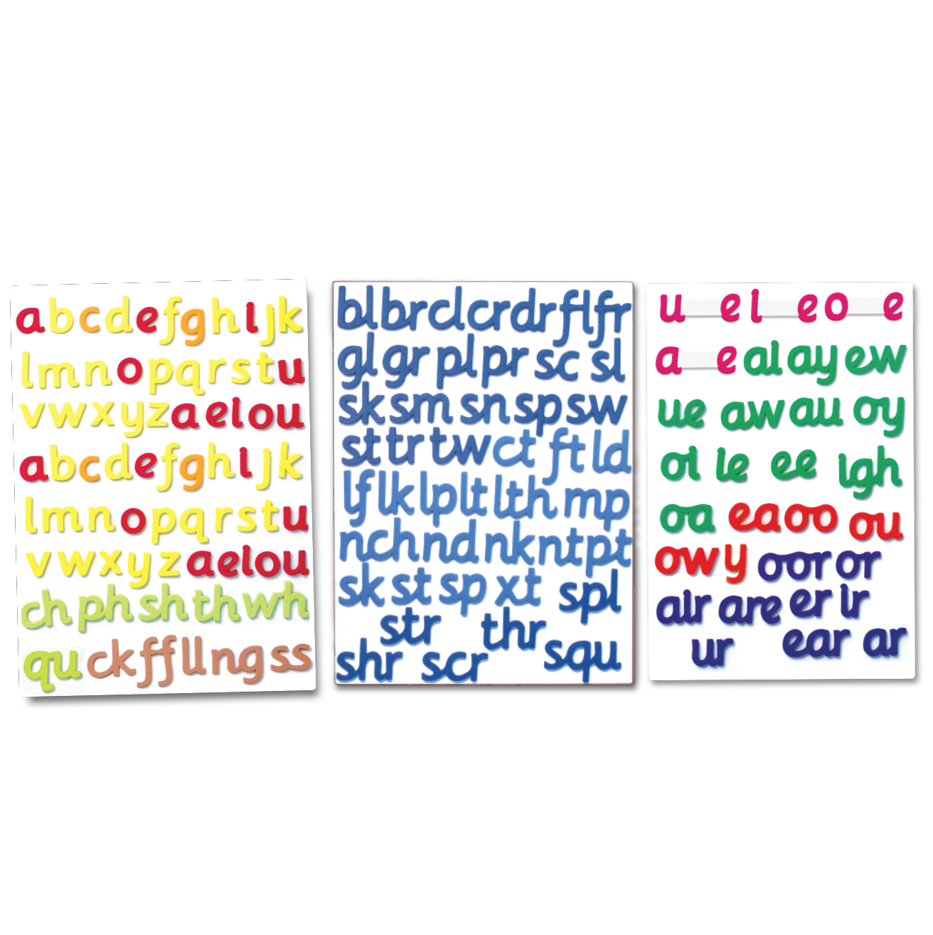 - Stage 2 contains 36 foam magnetic tiles in 3 colour groupings: Digraph endings, Blend beginnings and Blend endings. All tiles are lower case.