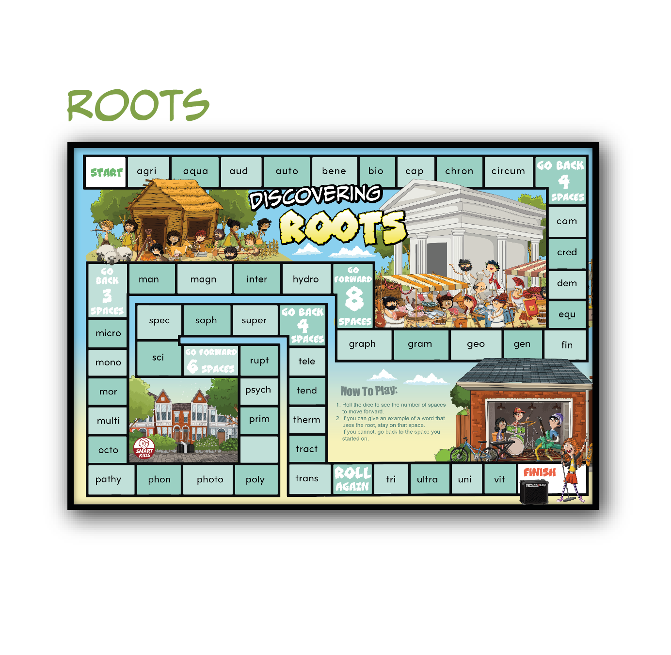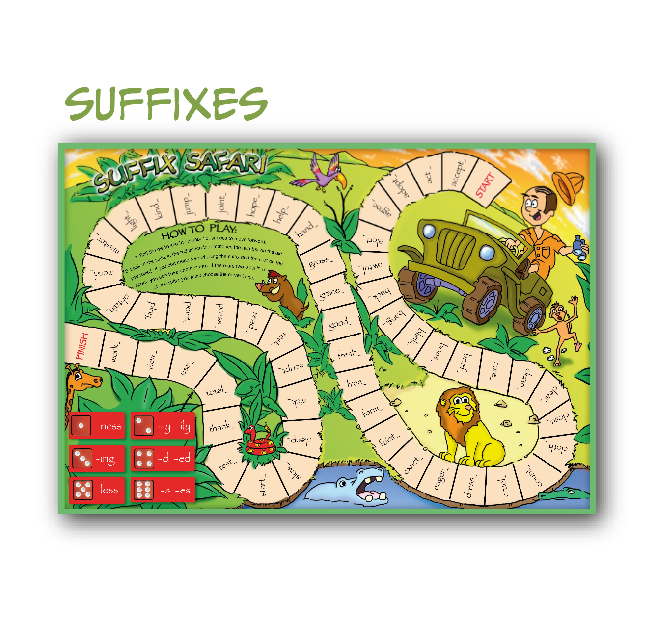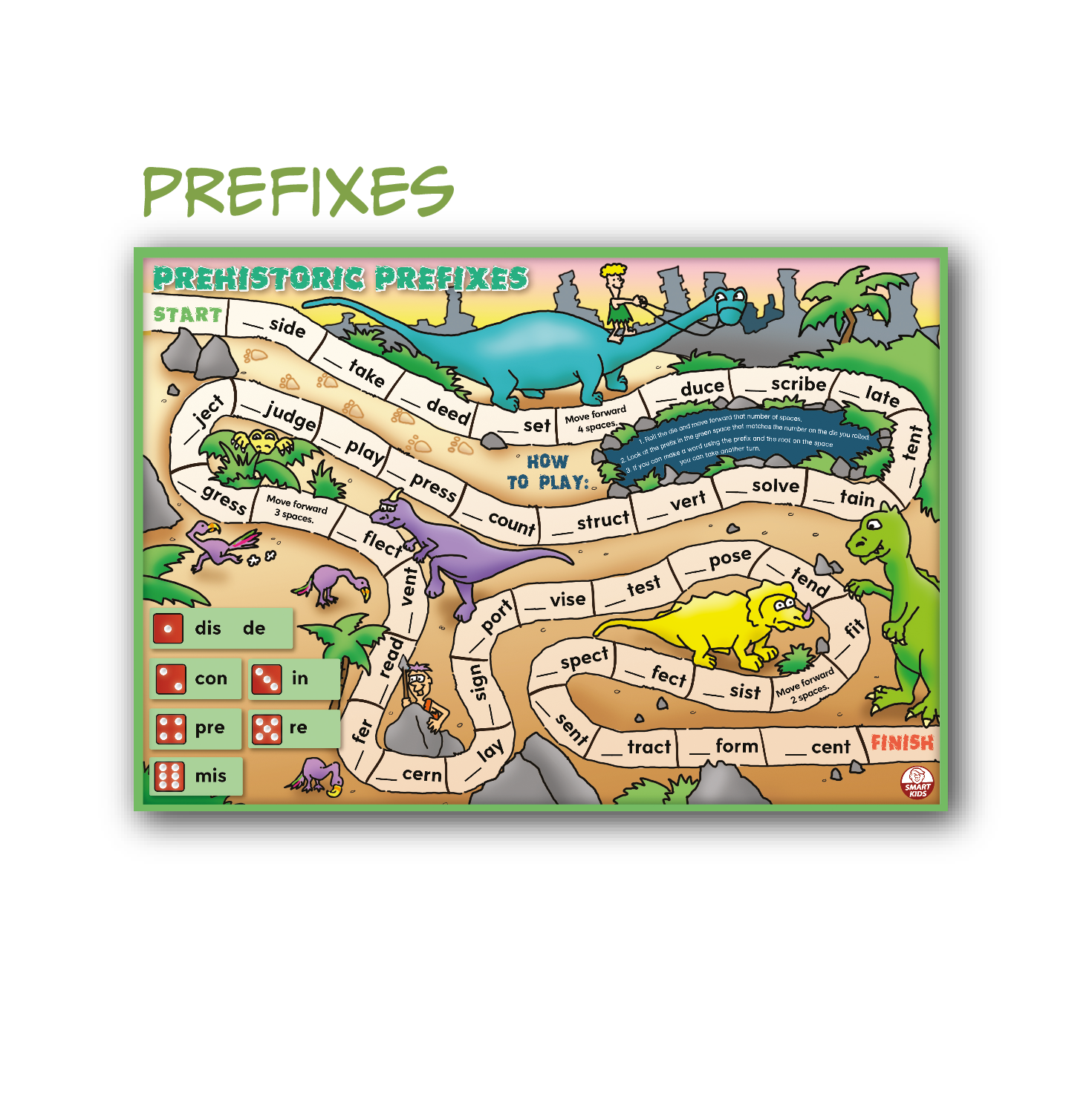 Three board games cover morphology: the study of words and their internal structure and relationships within a language (prefixes, roots and suffixes).