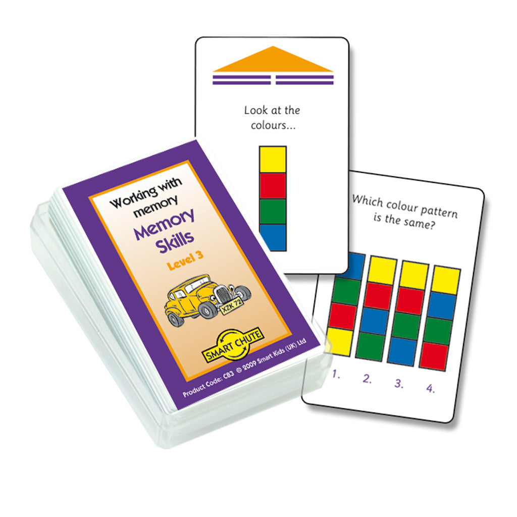Progress onto level 3 and memorise multiple differences between e.g. colour & shape with this pack of Chute Cards designed to develop visual memory skills and improve working memory. On the front are pictures, numbers, and/or colours to memorise. The flip side of the card then asks a question, e.g. showing the same illustration with something missing. Repost the card into the Smart Chute (sold separately) to see if the answer given was correct.
