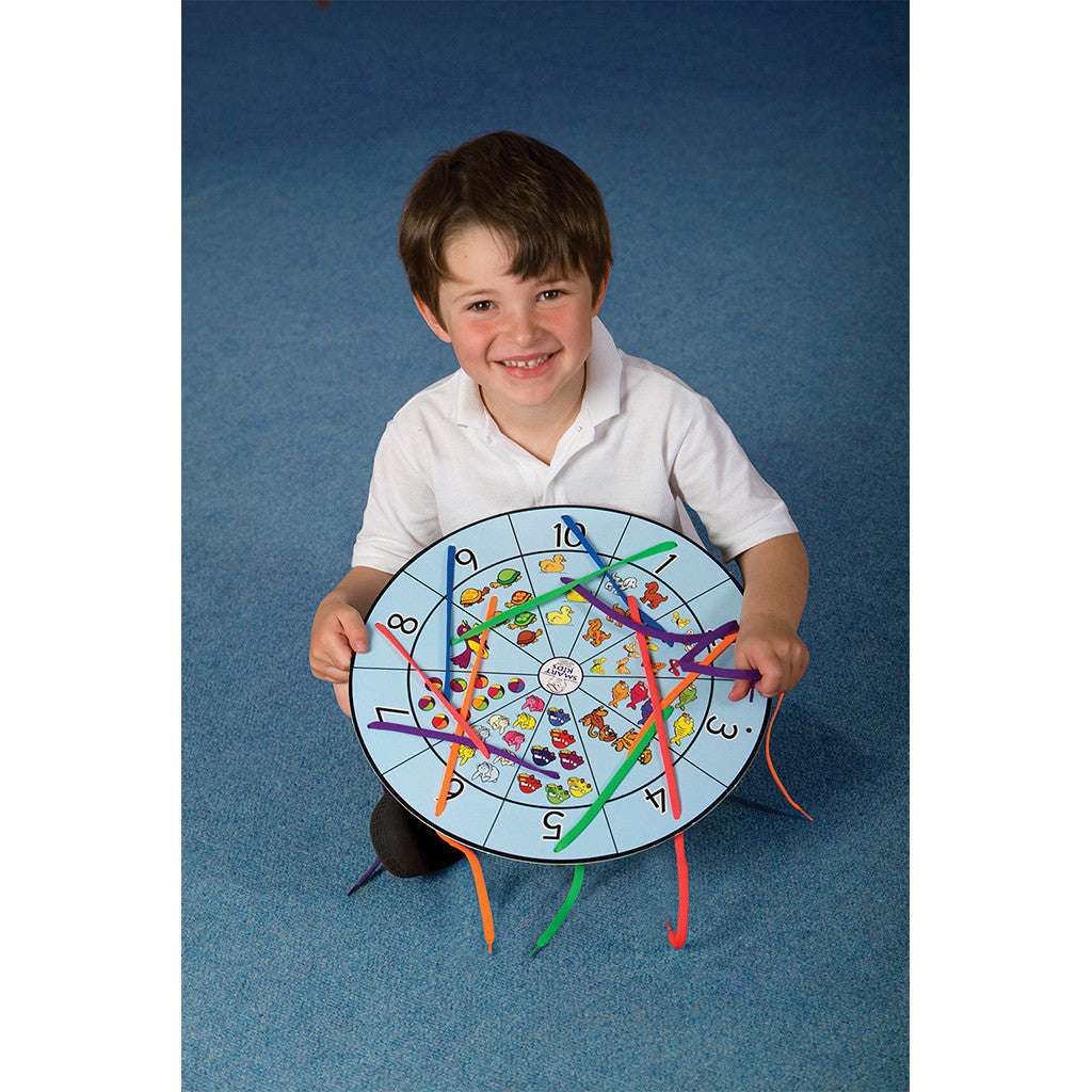 This large sturdy number wheel encourages children to reliably count a collection of objects. They then relate this number to the correct numeral and use the colourful laces to reinforce this. The number wheel comes with 10 brightly coloured laces. Learning number and the number system, counting and reading numbers.