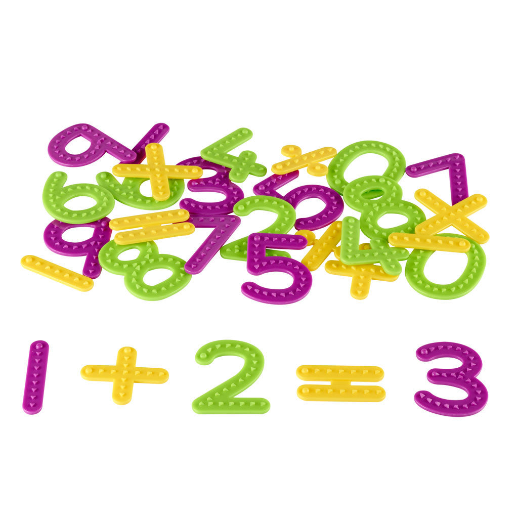A tactile way to practice number recognition and formation. Children trace the plastic numbers and operation signs with their finger, starting at the dot and following the raised arrow texture for guidance. Classroom set includes: 128 textured tactile numbers, 14 operations signs & activity guide. Largest number measures 10cm x 7cm. Ages 4-8